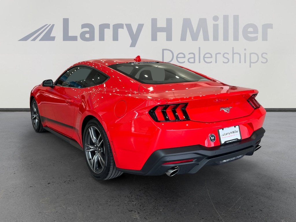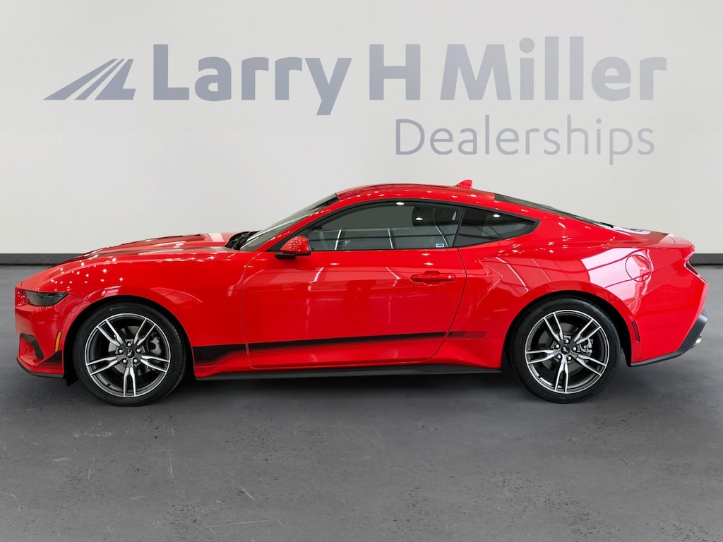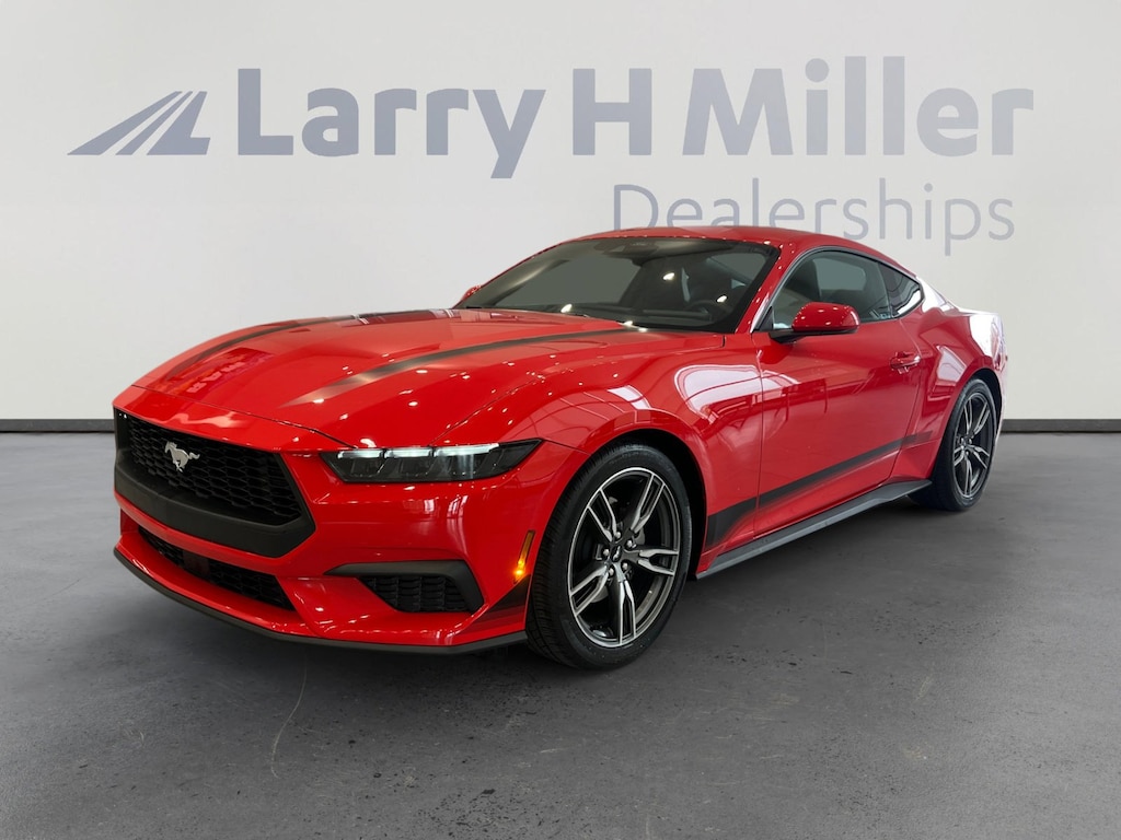 Larry H. MIller Chrysler Dodge Ram Fiat offers this 2025 Race Red Ford Mustang EcoBoost RWD. It is well equipped and includes these standard and optional features and benefits: Equipment Group 101A High Package (9-Speaker Stereo System, Cloth/Vinyl Heated Bucket Seats, and SiriusXM w/360L & HD Radio), Wheel & Stripe Package (Wheels: 19 x 8.5 Machined-Face Aluminum), 4-Wheel Disc Brakes, ABS brakes, Air Conditioning, Alloy wheels, AM/FM Stereo, Auto High-beam Headlights, Automatic temperature control, Brake assist, Bumpers: body-color, Compass, Delay-off headlights, Driver door bin, Driver vanity mirror, Dual front impact airbags, Dual front side impact airbags, Electronic Stability Control, Emergency communication system: 911 Assist, Exterior Parking Camera Rear, Four wheel independent suspension, Front anti-roll bar, Front Bucket Seats, Front Center Armrest, Front dual zone A/C, Front reading lights, Fully automatic headlights, Illuminated entry, Internet access capable: FordPass Connect, Knee airbag, Leather Shift Knob, Low tire pressure warning, Occupant sensing airbag, Outside temperature display, Overhead airbag, Overhead console, Panic alarm, Passenger door bin, Passenger vanity mirror, Power door mirrors, Power steering, Power windows, Radio data system, Rain sensing wipers, Rear anti-roll bar, Rear Parking Sensors, Rear window defroster, Remote keyless entry, Speed control, Speed-sensing steering, Speed-Sensitive Wipers, Split folding rear seat, Sport steering wheel, Steering wheel mounted audio controls, SYNC 4, Tachometer, Telescoping steering wheel, Tilt steering wheel, Traction control, Trip computer, Variably intermittent wipers, Voltmeter, and Wheels: 18 x 8 Machined-Face Aluminum.