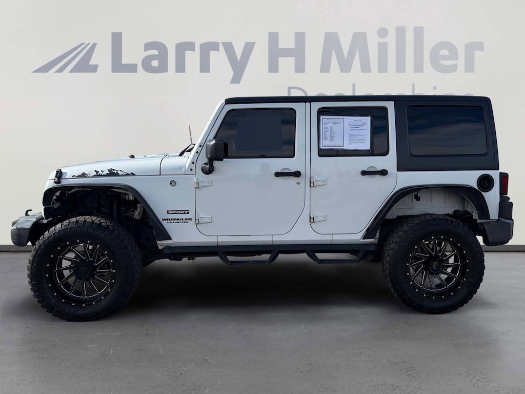 Connectivity Group (Remote USB Port, Tire Pressure Monitoring Display, Uconnect Voice Command w/Bluetooth, and Vehicle Information Center), Max Tow Package (Class II Receiver Hitch and Trailer Tow w/4-Pin Connector Wiring), Quick Order Package 24S (17 x 7.5 Aluminum Wheels, Auto-Dimming Mirror w/Reading Lamp, Chrome/Leather Wrapped Shift Knob, Deep Tint Sunscreen Windows, Front 1-Touch Down Power Windows, Leather Wrapped Steering Wheel, Power Convenience Group, Power Heated Mirrors, Power Locks, Remote Keyless Entry, and Security Alarm), Wrangler Unlimited Sport, 4D Sport Utility, 3.6L V6 24V VVT, 5-Speed Automatic, 4WD, Bright White Clearcoat, Black Cloth, 1-Yr SiriusXM Radio Service, 4-Wheel Disc Brakes, 8 Speakers, ABS brakes, Air Conditioning, AM/FM radio, Anti-Spin Differential Rear Axle, Black 3-Piece Hard Top, Brake assist, CD player, Cloth Seats w/Adjustable Head Restraints, Compass, Delete Sunrider Soft Top, Driver door bin, Driver vanity mirror, Dual front impact airbags, Electronic Stability Control, Freedom Panel Storage Bag, Front anti-roll bar, Front Bucket Seats, Front Center Armrest w/Storage, Front fog lights, Integrated roll-over protection, Low tire pressure warning, Normal Duty Suspension, Occupant sensing airbag, Outside temperature display, Passenger door bin, Passenger vanity mirror, Radio: 130, Rear anti-roll bar, Rear Window Defroster, Rear Window Wiper/Washer, SIRIUS Satellite Radio, Speed control, Split folding rear seat, Tachometer, Tilt steering wheel, Traction control, Trip computer, Variably intermittent wipers, 16 x 7.0 Luxury Styled Steel Wheels, Power steering, and Steering wheel mounted audio controls.